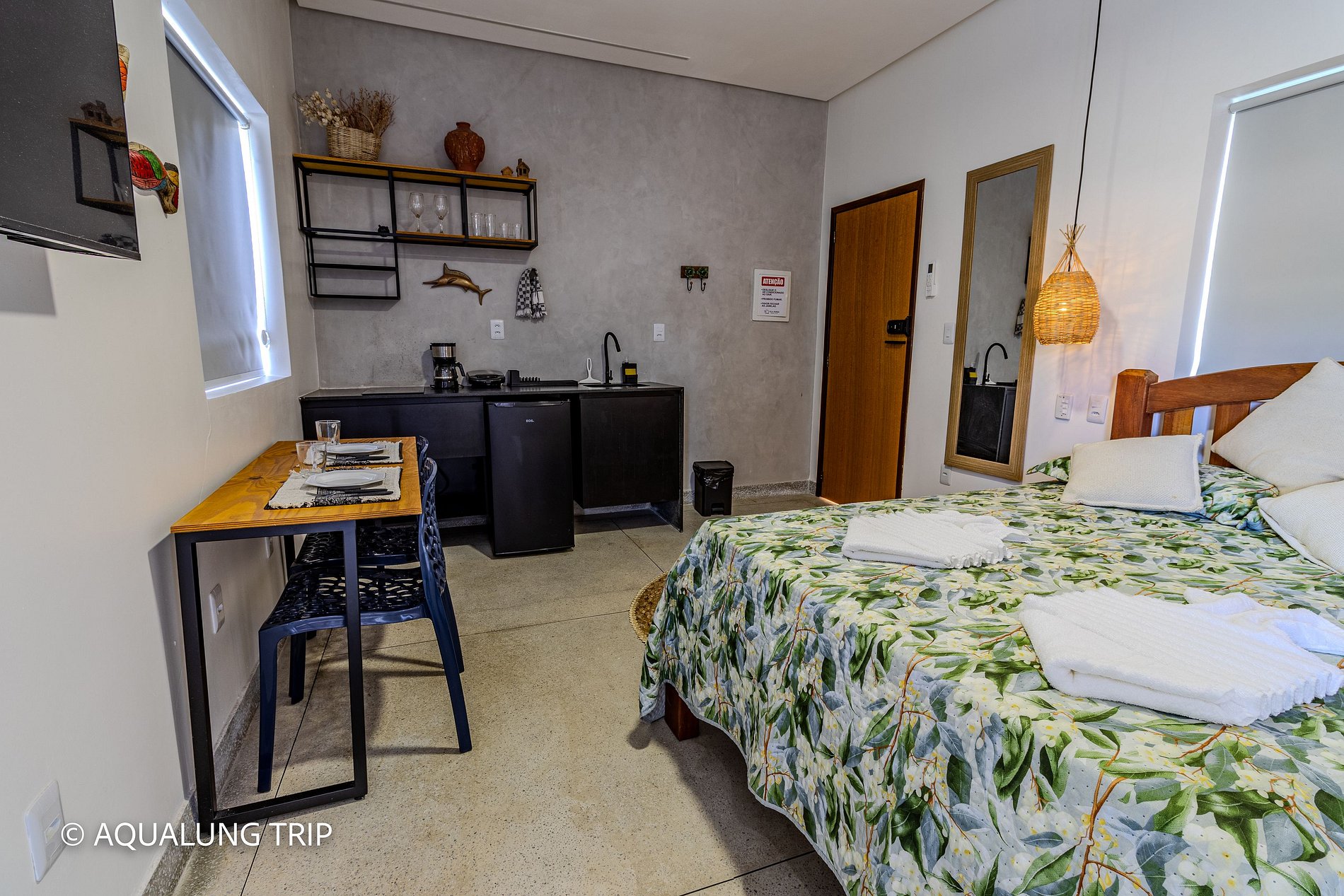Nosso studio acolhe até 2 pessoas em 30m², com Smart TV 42", internet, ar condicionado tipo Split, cozinha equipada e banheiro completo. Acomodações incluem cama de casal, com roupa de cama e toalhas fornecidas.