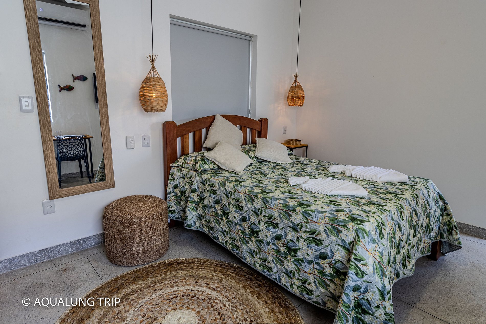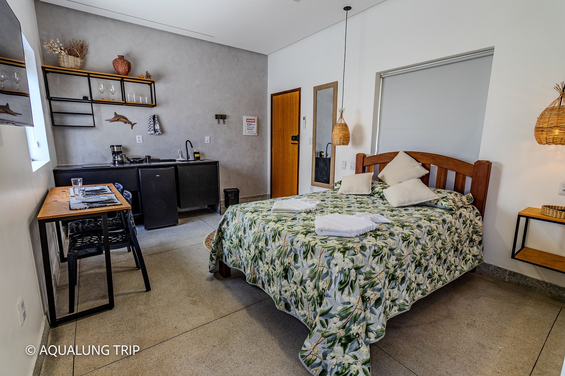 Nosso studio acolhe até 2 pessoas em 30m², com Smart TV 42", internet, ar condicionado tipo Split, cozinha equipada e banheiro completo. Acomodações incluem cama de casal, com roupa de cama e toalhas fornecidas.