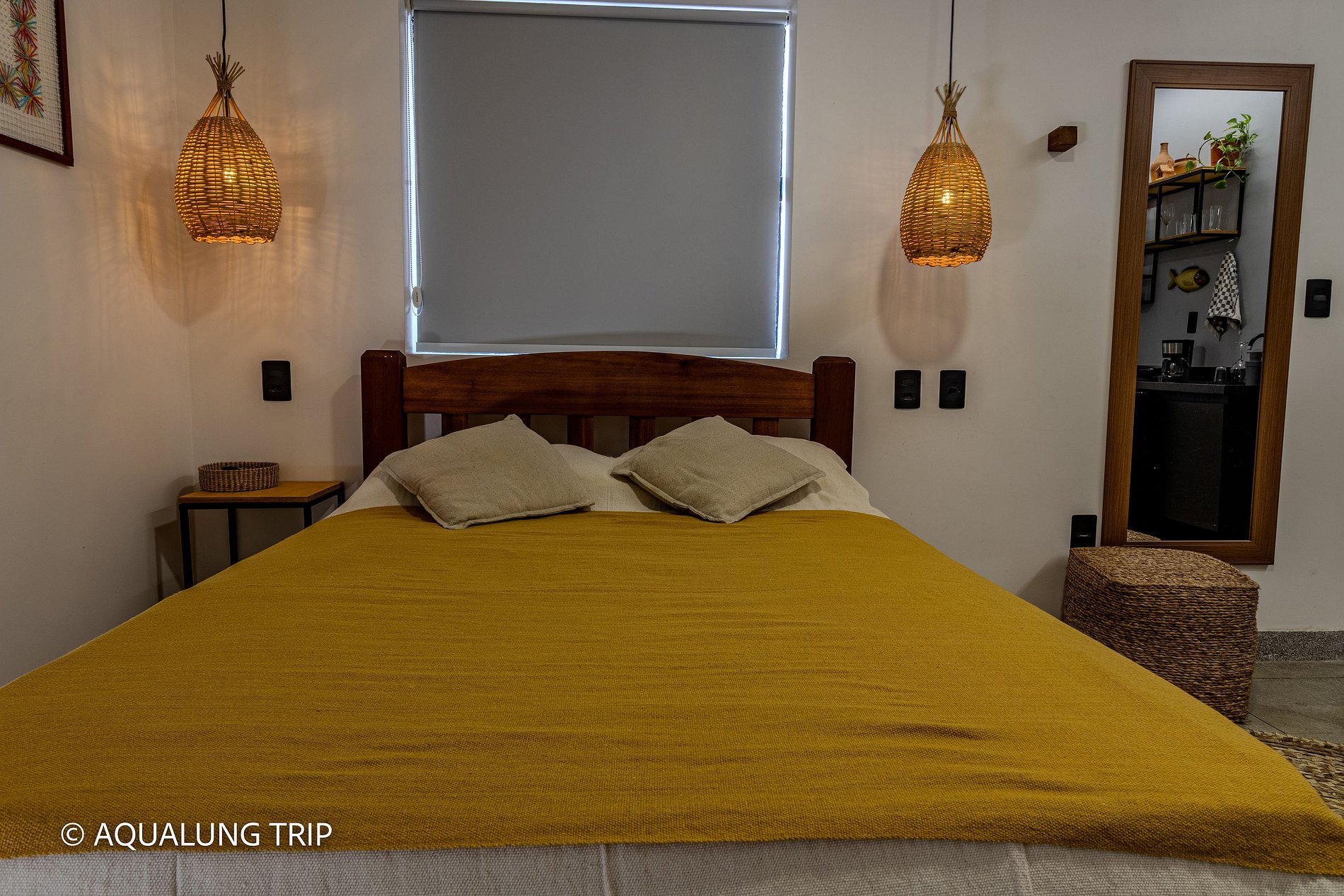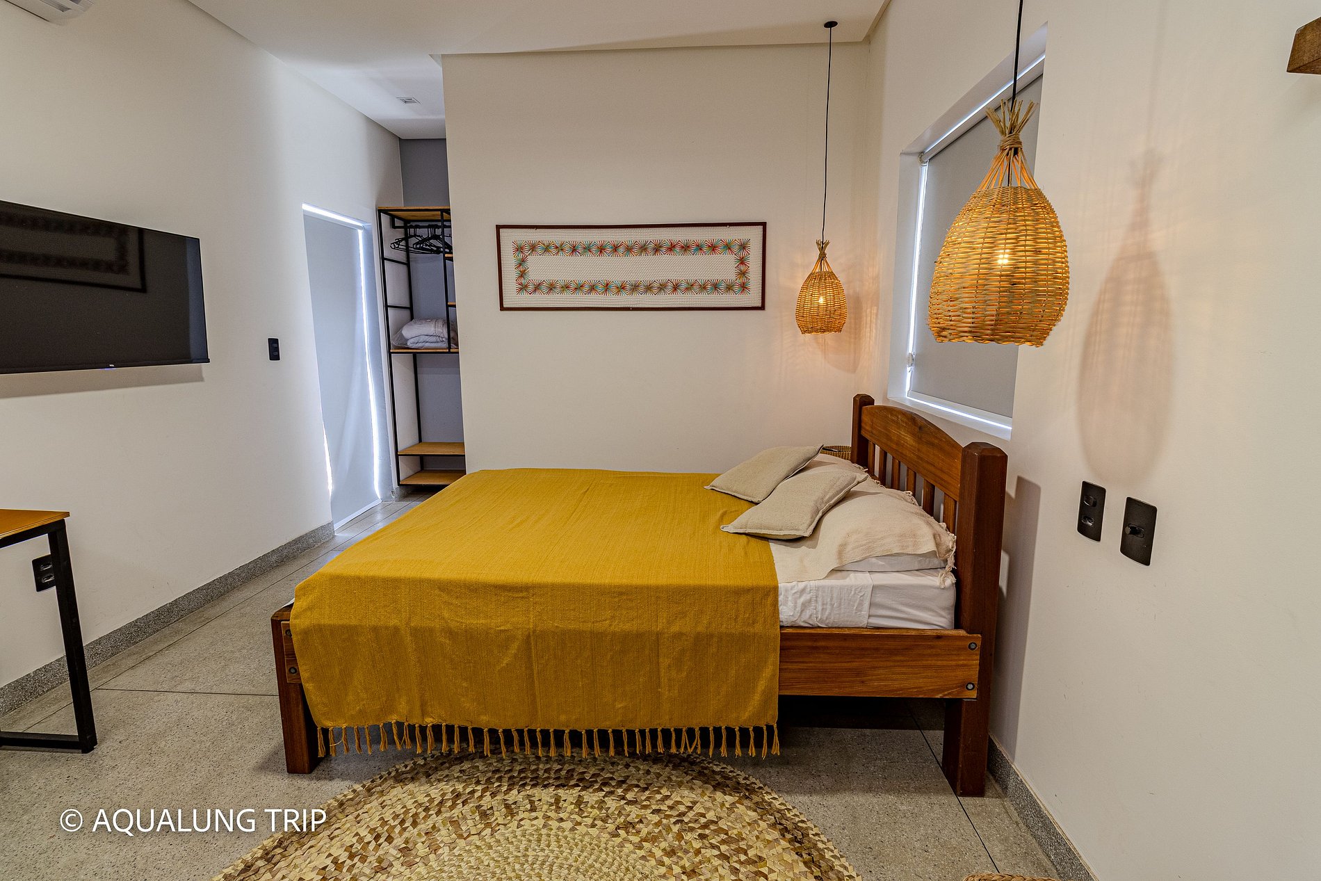 Nosso studio acolhe até 2 pessoas em 30m², com Smart TV 42", internet, ar condicionado tipo Split, cozinha equipada e banheiro completo. Acomodações incluem cama de casal e bicama, com roupa de cama e toalhas fornecidas.