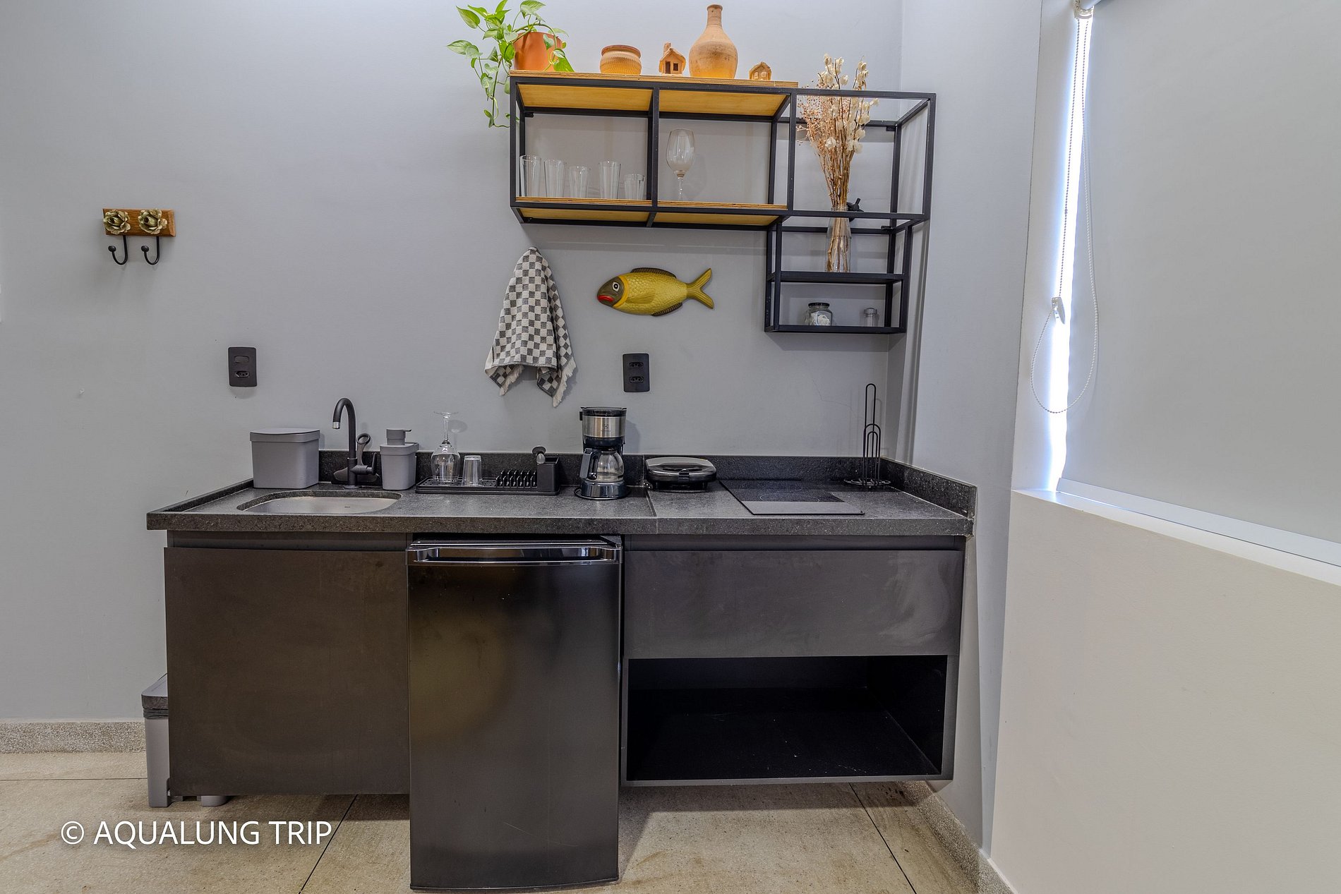 Os hóspedes têm acesso livre a todas as áreas do studio, incluindo a cozinha completa e o banheiro.